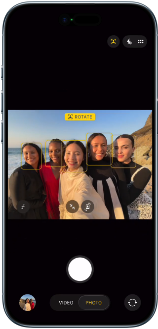La nueva cámara frontal te da opciones de sobra para encuadrar tus fotos y vídeos como quieras. Toca para ampliar el campo de visión y cambiar entre vertical y horizontal sin girar el iPhone. Y en los selfies de grupo, el plano se amplía para que nadie se quede fuera.