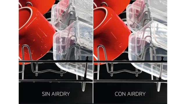La tecnología AirDry abre automáticamente la puerta del lavavajillas al final del ciclo, creando una ventilación natural que optimiza el secado. Esto reduce el consumo energético y garantiza resultados brillantes incluso en recipientes de plástico.
